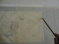 まず、敷紙を場板と絵の間に入れた後、水分を加えます。敷紙は絵や紙本が痛むのを防ぐためです。次に軸袋を着けます。軸袋は上軸、下軸を着ける為のもので,文字通り軸を包む袋のようなものです。 |