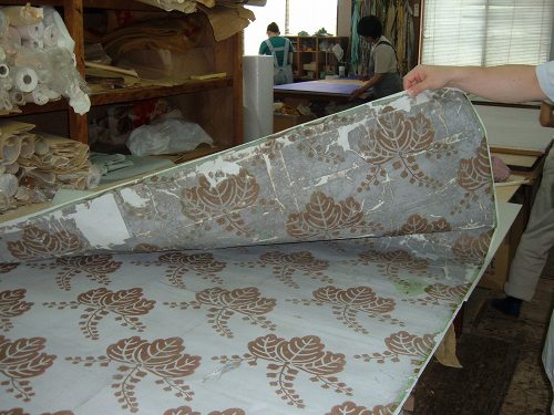 型押し紙を襖より剥離し全体を膠などで型押しそのものを固定させて強靭な手漉き和紙で裏打ちをして補強しました。不足している破損部分の模様は顔料と泥絵具にて